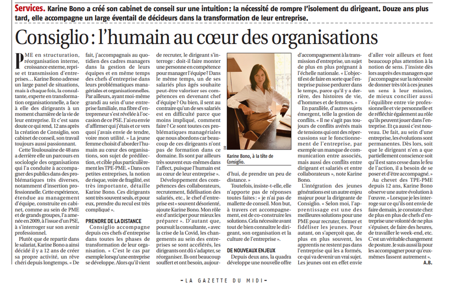 Si aujourd’hui CONSIGLIO souhaite faire perdurer les histoires de vie des entreprises sur les territoires, Karine BONO sa fondatrice, a fait un choix naturel, en cohérence avec ses valeurs et son histoire entrepreneuriale familiale, d’accompagner les chefs d’entreprises de PME, qui ont une volonté et la conviction que de réussir les transformations de leurs entreprises passe avant tout par la gestion des femmes et des hommes, leur talent mais aussi leurs craintes voire inquiétudes quant aux changements.